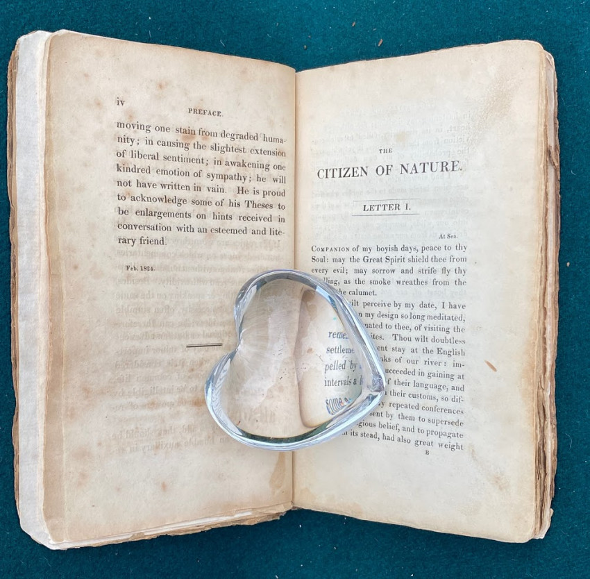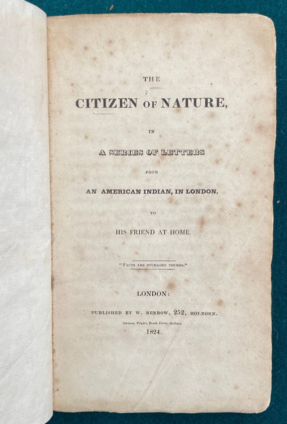 The Citizen of Nature, in a series of letters from an American Indian, in London, to his friend at home. London: ‘published by W. Benbow, 252, Holborn. Johnson, Printer, Brook Street, Holborn’, 1824. 12mo (7 ½ x 4 ½ins; 190 x 114mm), uncut, pp.[i-ii, i-]iv; [1-]238. Condition of the contents: some toning and spotting, marginal in the main, tear to pp.11/12 upper blank margin. Original drab paper-covered boards. Condition of binding: rebacked, part of original label laid down, later endpapers.