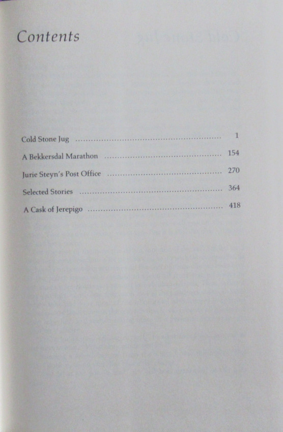 Volume 2-Cold Stone Jug - A Bekkersdal Marathon-Jurie Steyn's Post Office - A Cask of Jerepigo. Half Title- Title - Contents - Foreword by Lionel Abrahams. 594 pages text.
