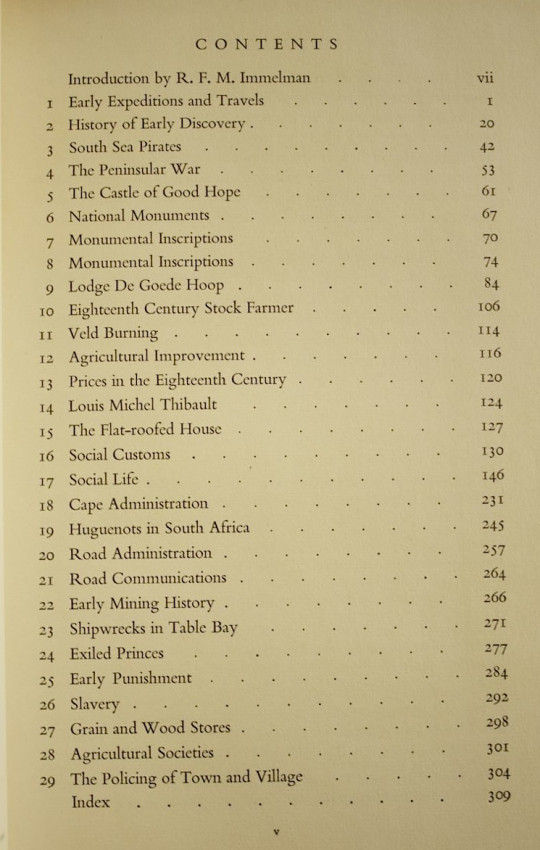 Includes: Early Expeditions and Travels, South Sea Pirates, The Castle of Good Hope, Monumental Inscriptions, Prices in the Eighteenth Century, Louis Michel Thibault, The Flat-Roofed House, Social Customs, Social Life, Huguenots in South Africa, Road Communications, Early Mining History, Shipwrecks in Table Bay, Exiled Princes, Early Punishment, Slavery, the Policing of Town and Village etc.
