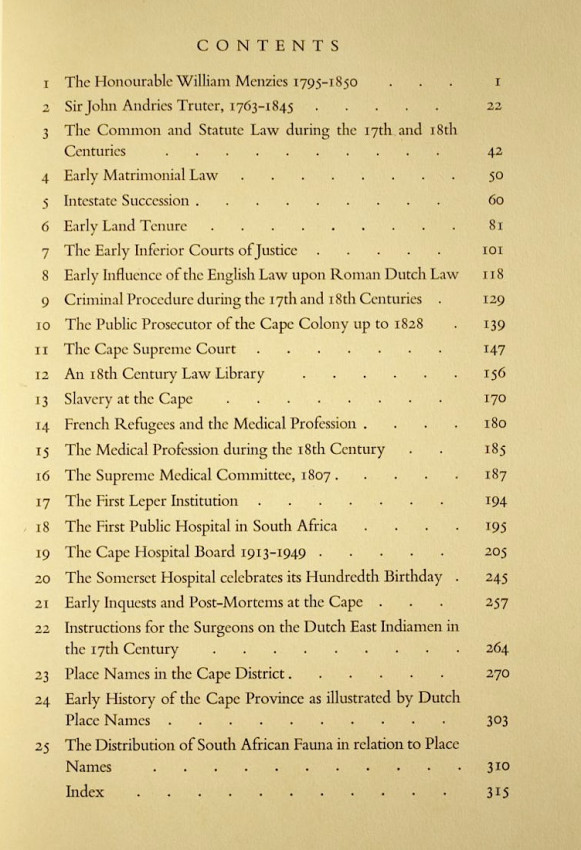 Includes: Sir John Andries Truter (1763-1845), Early Matrimonial Law, Intestate Succession, Early Land Tenure, Criminal Procedure during the 17th & 18th Centuries, The Public Prosecutor of the Cape Colony up to 1828, An 18th Century Law Library, Slavery at the Cape, French Refugees and the Medical Profession, The First Leper Institution, The First Public Hospital in South Africa, Early Inquests and Post-Mortems at the Cape, Instructions for the Surgeons on the Dutch East Indiamen in the 17th Century, Place Names in the Cape District, Early History of the Cape Province as illustrated by Dutch Place Names etc.