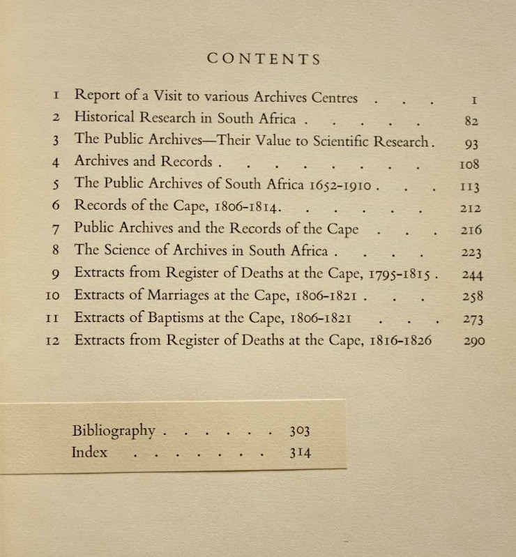 Includes: The Public Archives - their Value to Scientific Research, The Science of Archives in South Africa, Extracts from Register of Deaths at the Cape 1795 - 1815, Extracts from Marriages and Baptisms at the Cape from 1806-1821 etc.