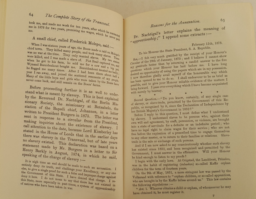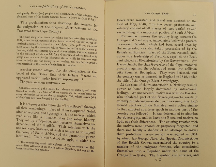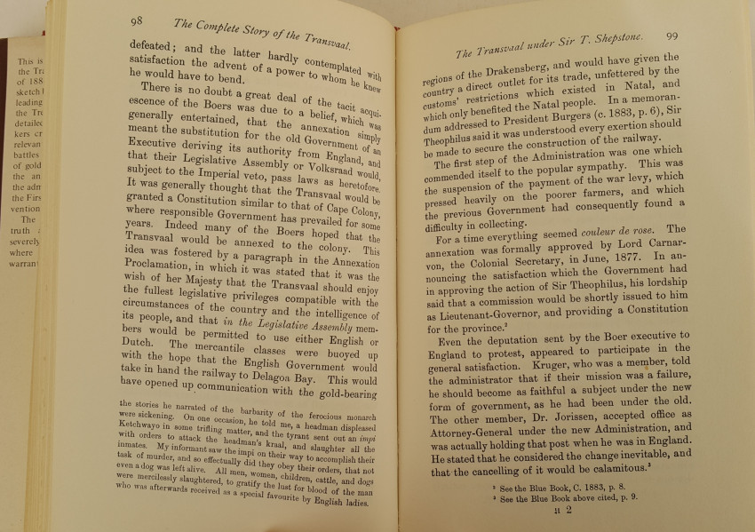 This is a comprehensive history of the Transvaal up to the Convention of 1884. The early chapters briefly describe events leading up to the Great Trek. The story becomes detailed as soon as the Trekkers cross the Vaal river. The battles for leadership; The discovery of gold; The Delagoab Bay Railway; The annexation of the Transvaal; The administration of Shepstone; The First Boer War and the two Conventions are fully described. The author had no hesitation in criticising Boer, or Brit, when he felt it justified.