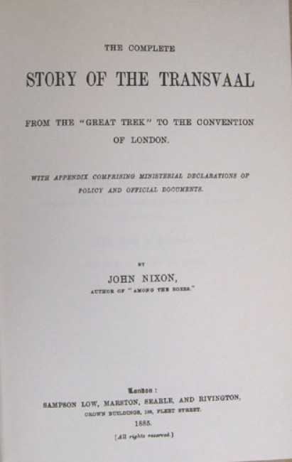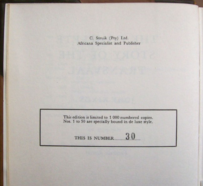 This is the 42nd volume in the Africana Collectanea Series. The edition was limited to 1,000 numbered copies, of which numbers 1 to 50 were bound in the "de luxe' style. Original brown leather spine and corners with a green title label on the spine with gilt titling and the publisher's device on the upper board. 6 prelims followed by a facsimile of the 1885 Sampson Low, London edition, with xxiv prelims, 372 pages, double page sketch map of the Transvaal.