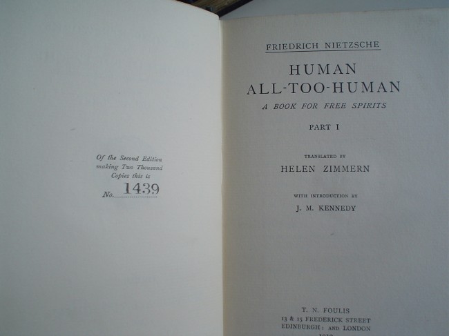 The First Complete and Authorised English Translation. In two parts. Volume 6 and volume 7 of the Human, All-too-human- series. 366 and 410 pages. In good condition. Part one is numbered 1439 of 2000 copies printed. Printed 1910. Part two is numbered 997 of 1500 copies printed. printed 1911. Translated by Paul Cohn and Helen Zimmern.