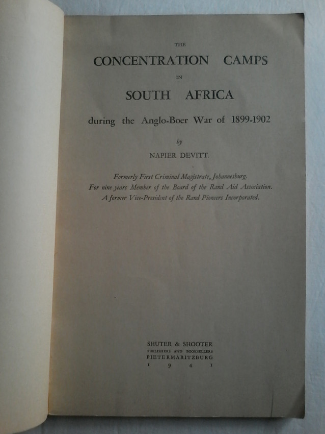 The concentration camps in South Africa during the Anglo - Boer War of 1899 - 1902, by Napier Devitt in 1941, Published by Shuter and Shooter, Pietermaritzburg.