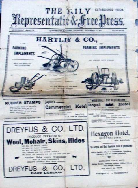 The Daily Representative & Free Press, newspaper, thursday, december 22, 1910, vol 53- no 48, Queenstown, Cape Colony, with Government Gazette, broadsheet, 8 pages, extensive wear and tear, complete, condition: fair.