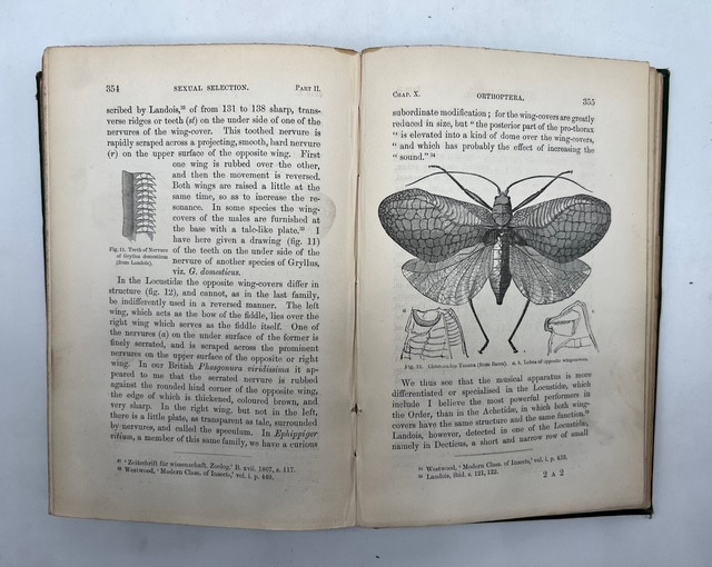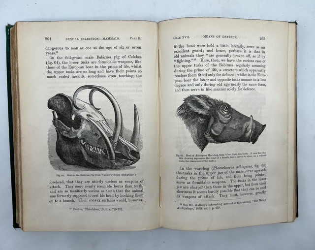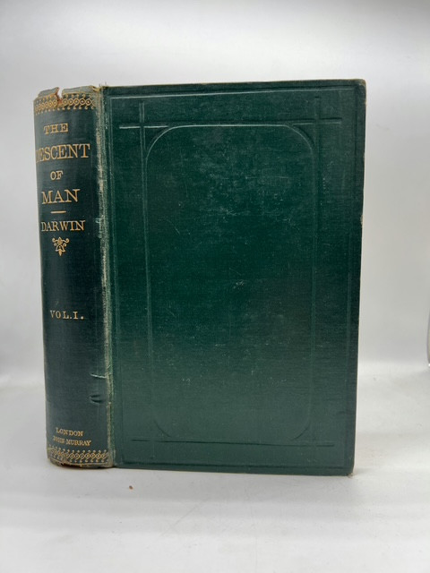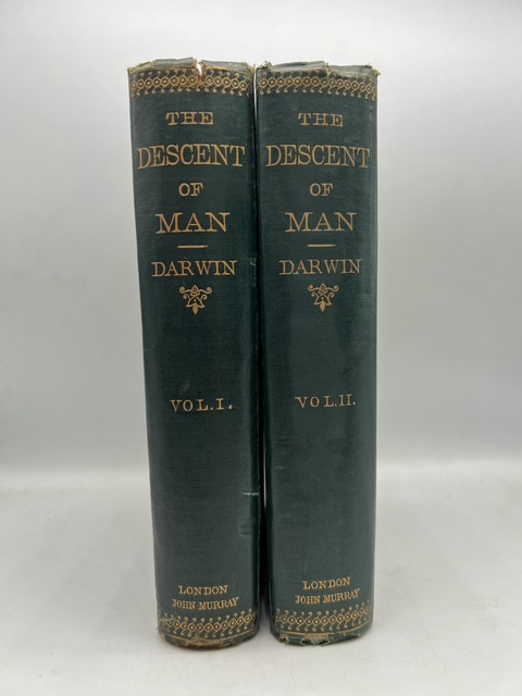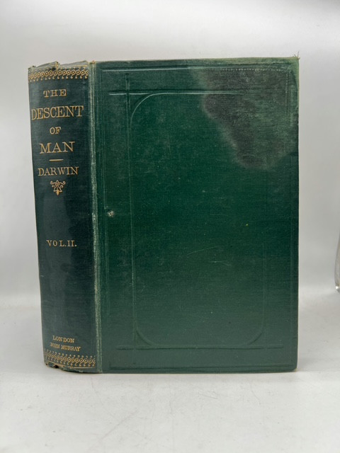 First Edition, third issue (Seventh Thousand) of the two volume edition. The first appearance of the word “evolution” in works by Darwin. In good condition. Both volumes show heavy signs of wear, with bumped corners, but are complete. The covers of Volume I are becoming separated from the binding and there is water damage to the cover of volume II and the binding is becoming exposed. Wear to the head and tail of the spines of both volumes, with a small split to the head of the spine of both volumes. Pencil marks in margins scattered throughout, highlighting lines of interest to previous owner. Previous owners name in pencil to the front fly leaf of both volumes with place and date : W.C.Crofts Adel August 1871. W.C.Crofts was an English Architect and entrepreneur who was a photographic pioneer.