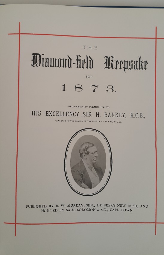 This facsimile of the 1873 edition was published to celebrate the centenary of the discovery of diamonds. A fascinating account of the discovery supported by 7 contemporary photographs. Only 500 copies of this Keepsake were published - a scarce and collectible item of Africana. This copy is in pristine condition. 38 Pages plus index. Old bookplate mark.