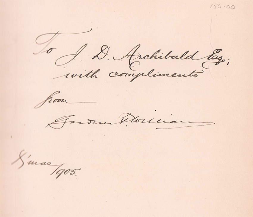 Inscription on front free end paper read: To J.D. Archibald Esq; with compliments from Gardner Williams X'mas 1905