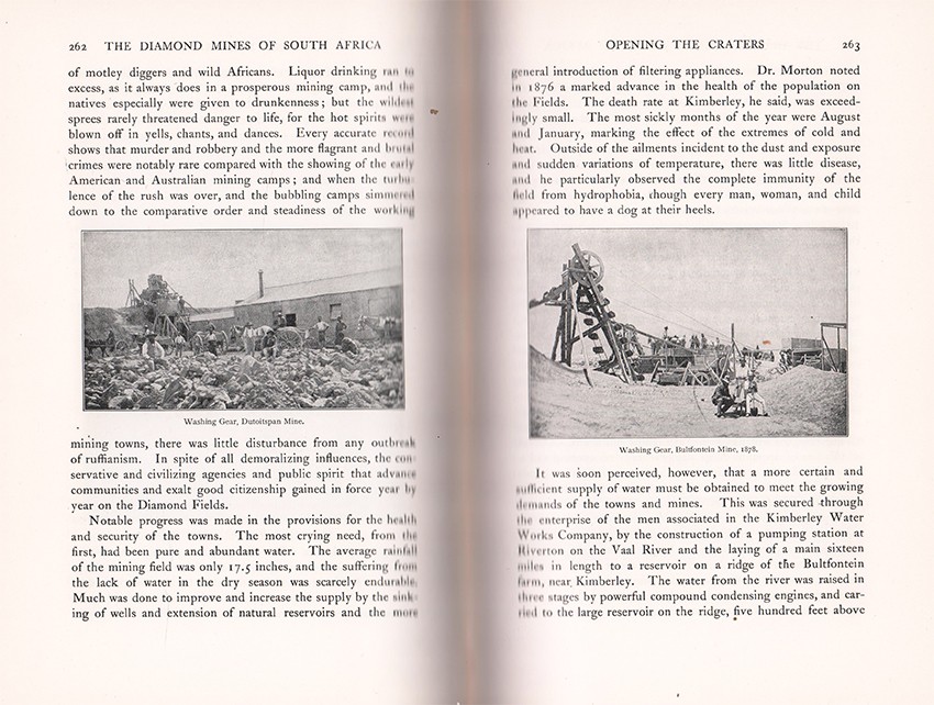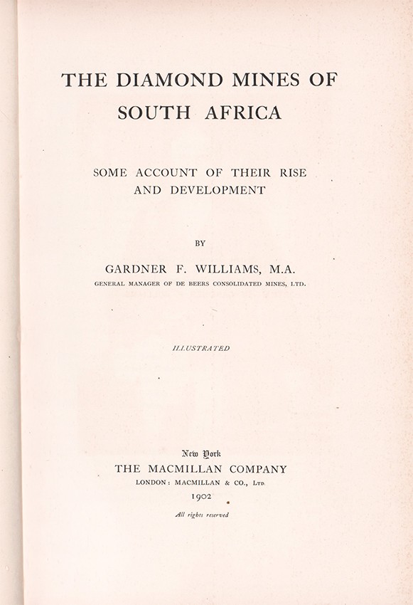 Mendelssohn (Sidney) South African Bibliography, Volume 2, page 614 : The author of this historical and practical account of the diamond industry, and especially of the South African diamond mines, was for many years the general manager of the De Beers Consolidated Mines, a gigantic undertaking founded by the late Cecil John Rhodes. The volume contains a full description of the mines with the fullest details respecting their working. Mr. Gardner Williams initiated the present system of work pursued in all underground diamond mines, and the work is replete with valuable information, and is the standard authority on all matters connected with diamonds and diamond-mining.