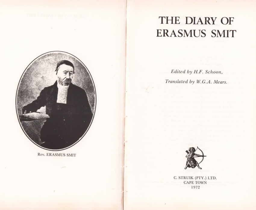 Erasmus Smit was the first minister of the Voortrekkers . He was born on August 2, 1778 in Buiksloot near Amsterdam. He became a missionary in America in 1801 and arrived at the Cape in 1804 . He worked with Dr. JT van der Kemp at Bethelsdorp. After the Dutch Reformed Church refused to ordain him, he became a teacher. He married the sister of the Voortrekker leader Gerrit Maritz and became their unofficial minister, held regular services, performed marriages and accompanied the Trek to KwaZulu-Natal . His diary is an important document of the Great Trek. He settled in Pietermaritzburg where he died in 1863. https://af.wikipedia.org/wiki/Erasmus_Smit