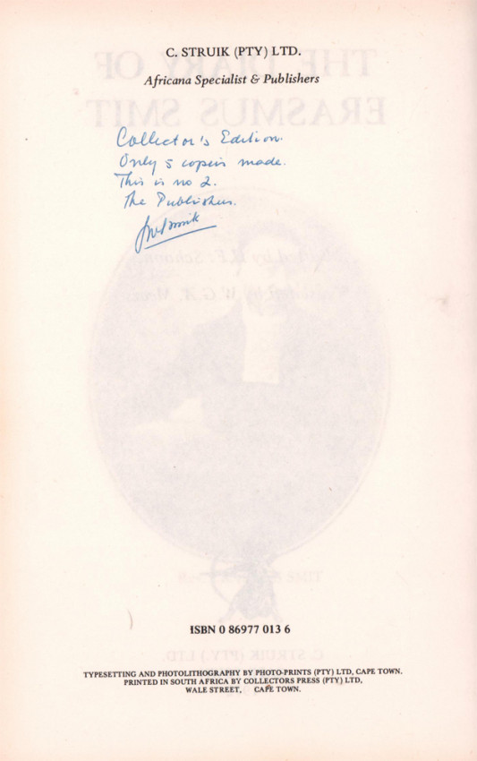On the verso of the title page is a handwritten note signed by the publisher: Collector’s Edition. Only 5 copies made. This is no.2