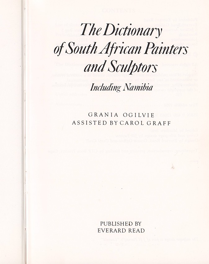 Editor's note. 'More than 1800 painters and sculptors are listed alphabetically, the criteria for inclusion being artists who have lived or worked in South Africa/Namibia and who have made a lasting contribution to its artistic life. The broad spectrum takes in the Dutch, English and French pioneers, artists trained overseas and who settled or spent some time in the area and the young professionals of today who are products of the established art institutions in the Republic.'