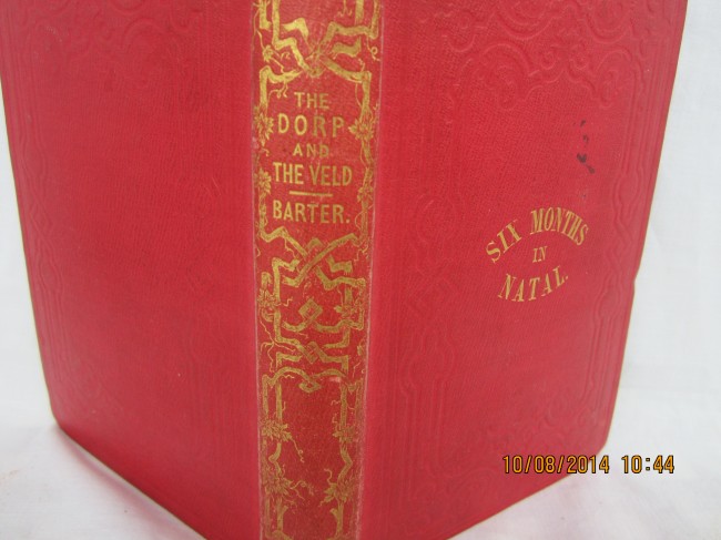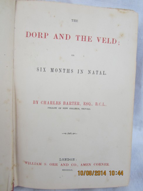 8vo, 7+264 pages : a graphic account of life in Natal & the Orange River Sovereignty; he got on well with the Boers, was unconvinced that the British settlers could make a go of farming in South Africa & suggests compulsion should be applied to the natives to get them to work; NOT LISTED IN MANDELSSOHN; original red boards, gilt lettering, bookplates, a very good copy of the RARE FIRST EDITION
