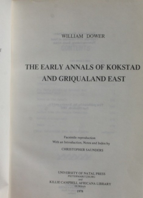 Hardcover-Rexine, xix + 192pp text with map and illustrations. Dust Jacket in poor condition, light foxing to rear end papers and map, otherwise in fine condition. “Dower's Early Annals has long been out of print and is now a rare item of Africana. This facsmile edition is both an important work-the fullest published source for many of the events it records-and entertaining reading. Above all, it provides an account of a still much neglected people: the Griquas of East Griqualand. Their occupation of 'Nomansland'. The annexation of 1874 and their 'rebellion' in April 1878 are all vividly described by one who was their missionary and lived among them for twenty years”.