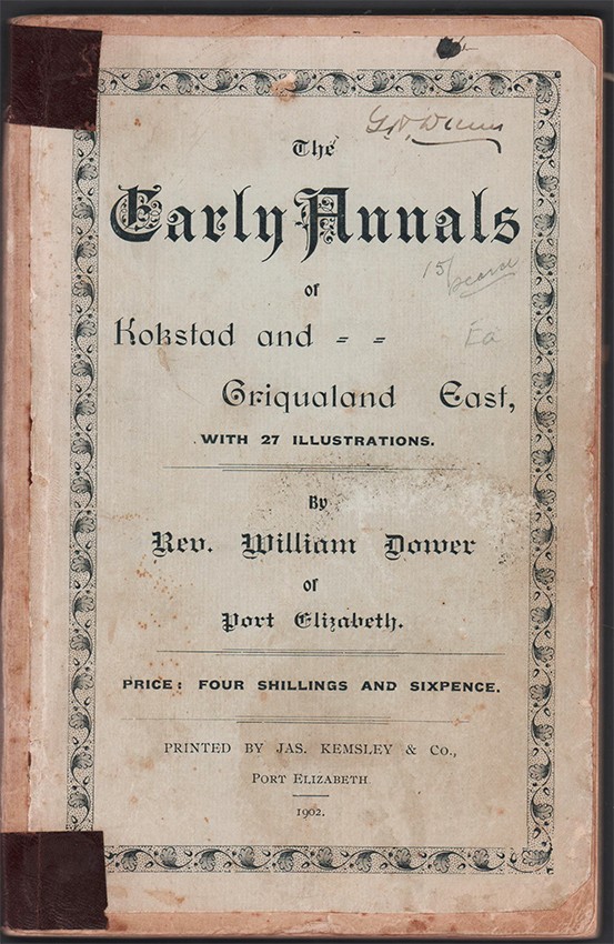 Mendelssohn (Sidney) South African Bibliography vol. 1 page 483 - 484: A pamphlet on the Griquas, their old and new country, and the progress and rise of the white settlers among them. The author, who was one of the founders of the town of Kokstad, in Griqualand East, gives an account of the early history of the tribe. Mention is made of the fact that the battle of Boomplaats was fought by the British mainly to defend the rights of the tribe against the Free State Boers. Nevertheless, in the confusion and disorder brought about by the retrocession of the Orange River sovereignty, the Republic acquired a large part of the country, and arrangements had to be made by Sir George Grey for the repatriation of part of the tribe in the territory then known as "Nomansland," now Griqualand East, situated between British Kaffraria and Natal.