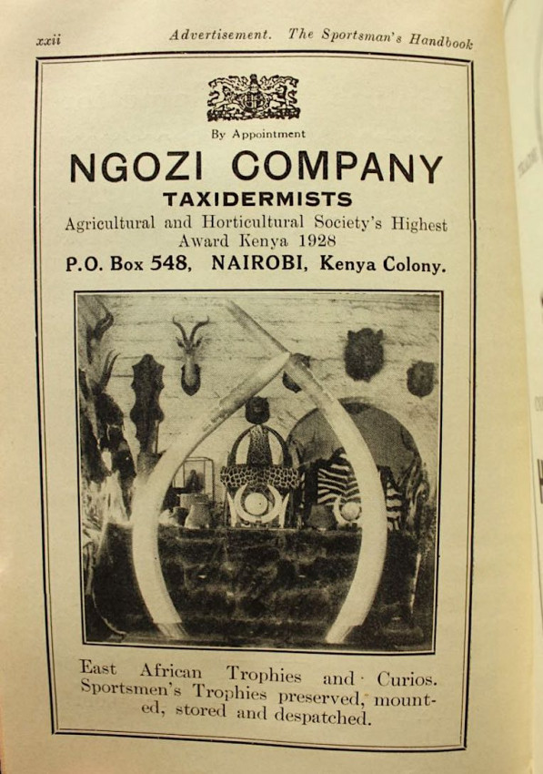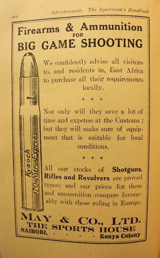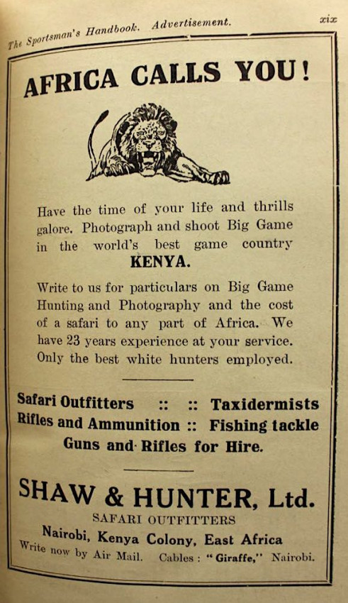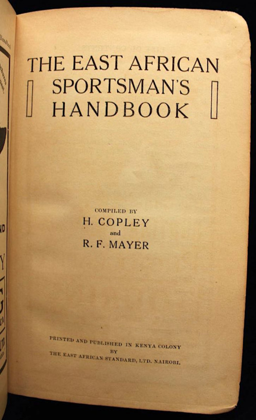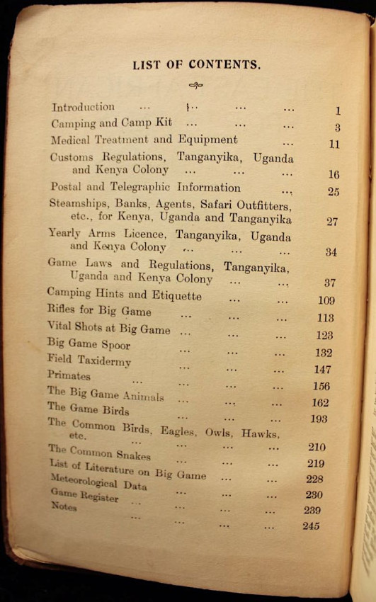 Big game hunting and bird shooting are covered in depth for the Sportsman in Kenya and Uganda. Rifles, game and habitat and game laws of the era. Also numerous period advertisements, plates of game spoor and trophies.