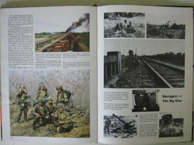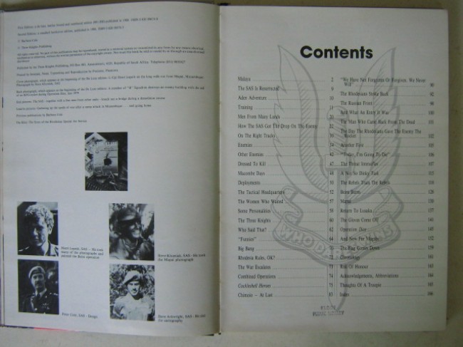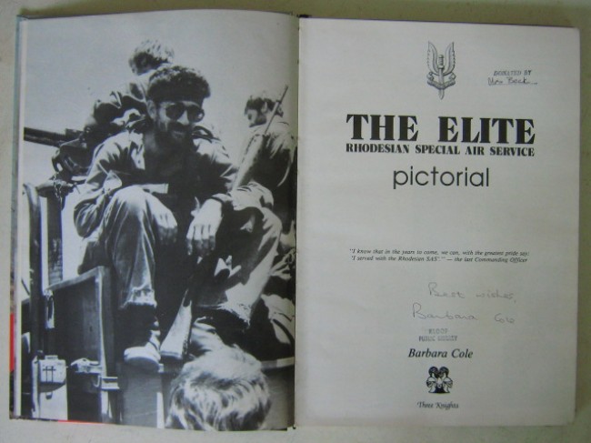 Pictorial record of the history of the Rhodesian Special Air Service, signed by the author on the title page. Although this is an ex-library copy, it is not showing much wear at all, except for a few small library stamps to the end-papers and remains of sticker removal (mainly lower f.f.e.p. area), slight bumps to the corners and bottom of spine, and the usual light rubbing to the covers - actually a very good copy.