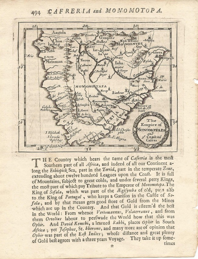 Morden has also added Mossel and Alagoa (Algoa) Bays on the south-east coast. The pages with all three states of the map have the incorrectly spelled MONOMOTOPA in the letterpress headline.