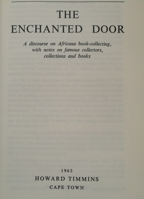 Although published 56 years ago, Godfrey's The Enchanted Door remains perhaps the best Africana book-collectors' primer, and this is a fine copy, number 166 of the first edition of 1200 numbered copies, with a Brodart-protected dustjacket and Dirk Friedlander's bookplate on the front free endpaper verso.