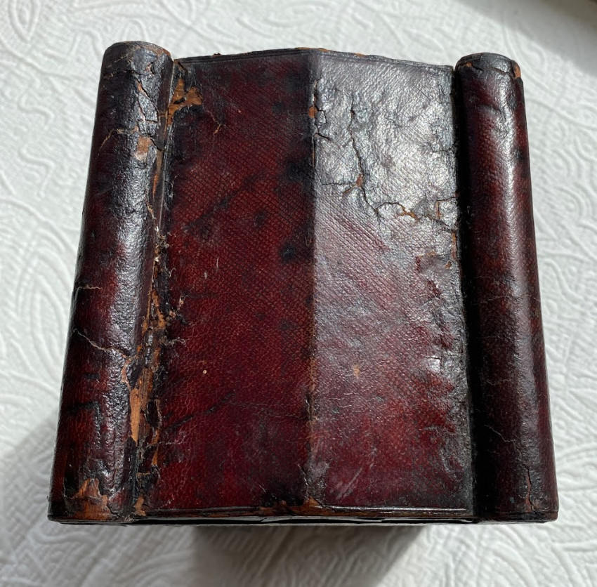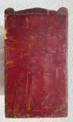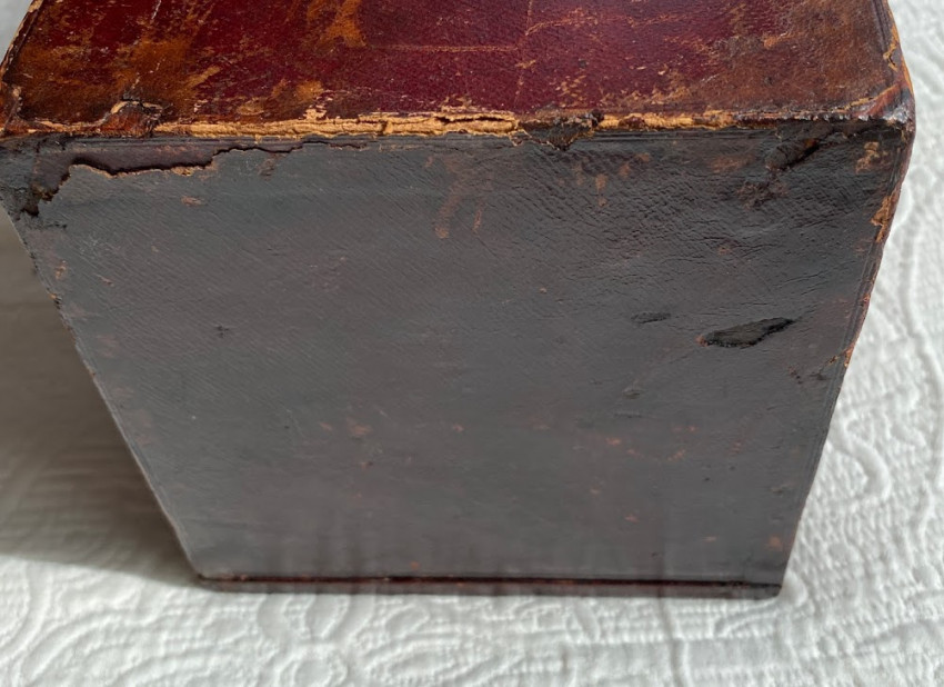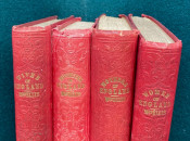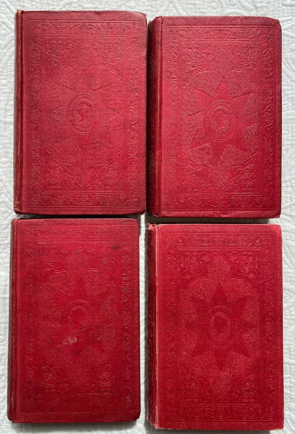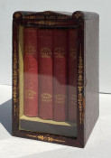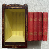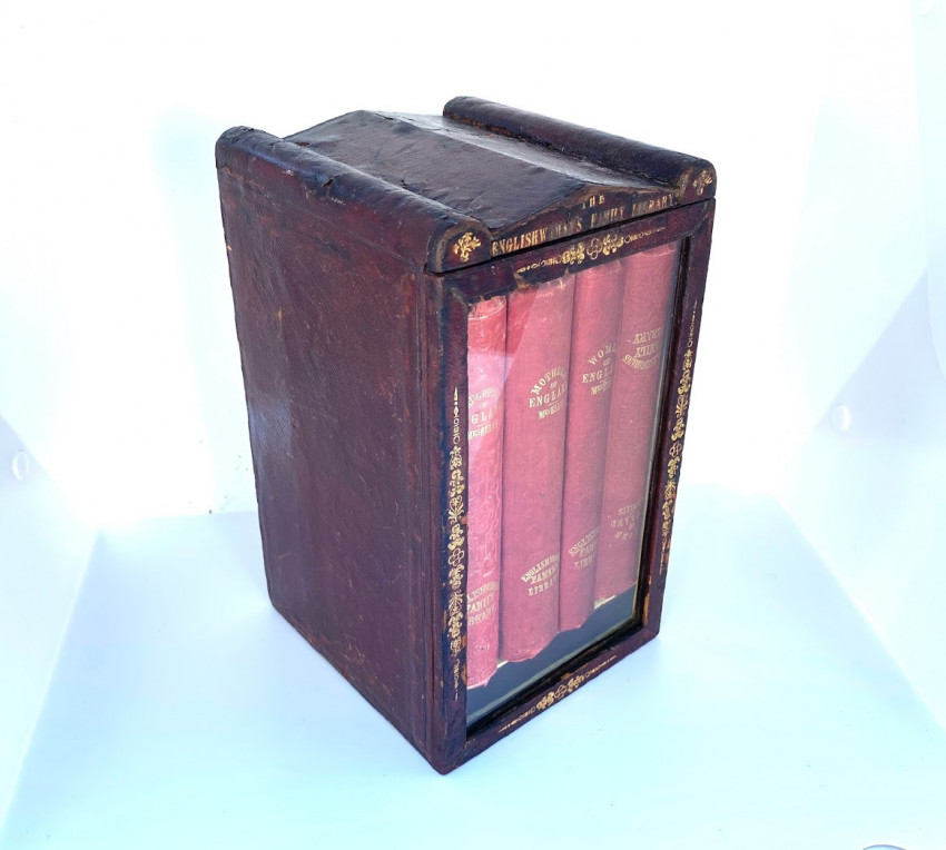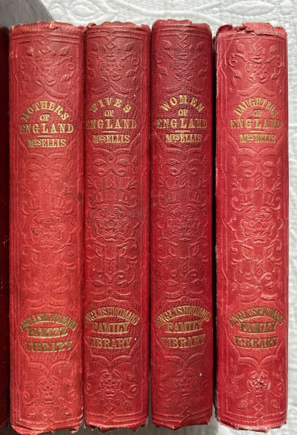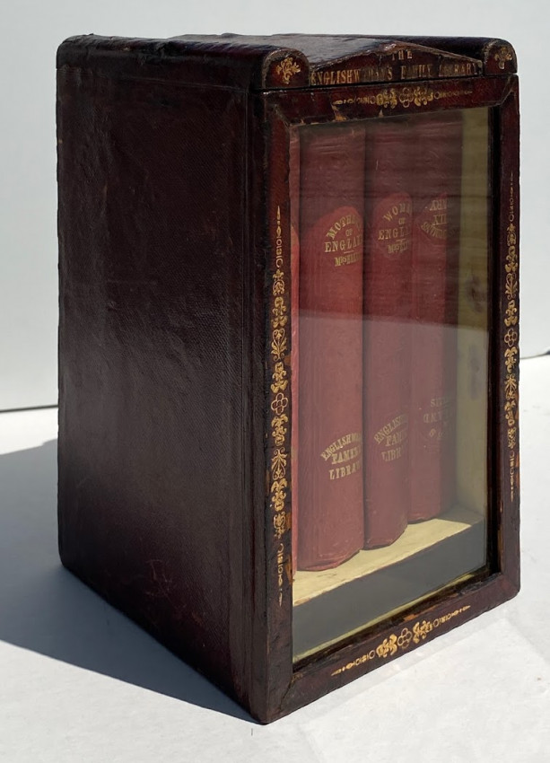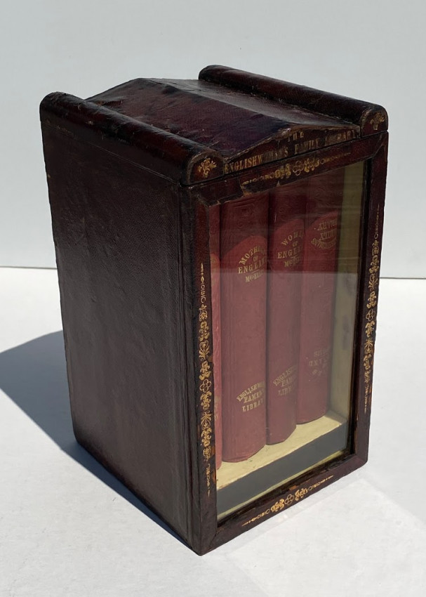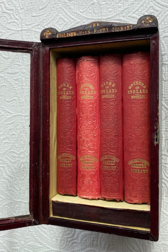 [The Englishwoman's Family Library] The Women of England; The Daughters of England; The Wives of England; The Mothers of England. London: Fisher, Son & Co. or Peter Jackson, [no dates]. 4 works in 4 volumes, small octavo (6 3/4 x 4 1/4in; 172 x 108mm). Engraved frontispieces. (Some spotting). Publisher’s red cloth, spines lettered in gilt and blocked in blind, covers blocked in blind, pale yellow endpapers (some bumping to extremities, some light soiling). Housed in the publisher's dark red thin-leather-covered rectangular wooden case (9 1/2 x 5 1/2 x 5 3/4in; 241 x 140 x 146mm), with a shaped ‘roof’ fronted by a stylized pediment, with a glass-fronted door, hinged to the left, push-button metal catch closing along right-hand side, pediment face lettered "The Englishwoman's Family Library", the front face of the door and the pediment also decorated in gilt, the interior of case lined with matching pale yellow paper, later removable paper and cloth-covered ‘dais’ to interior (some wear to leather [see images]).