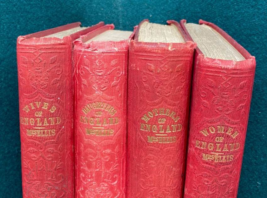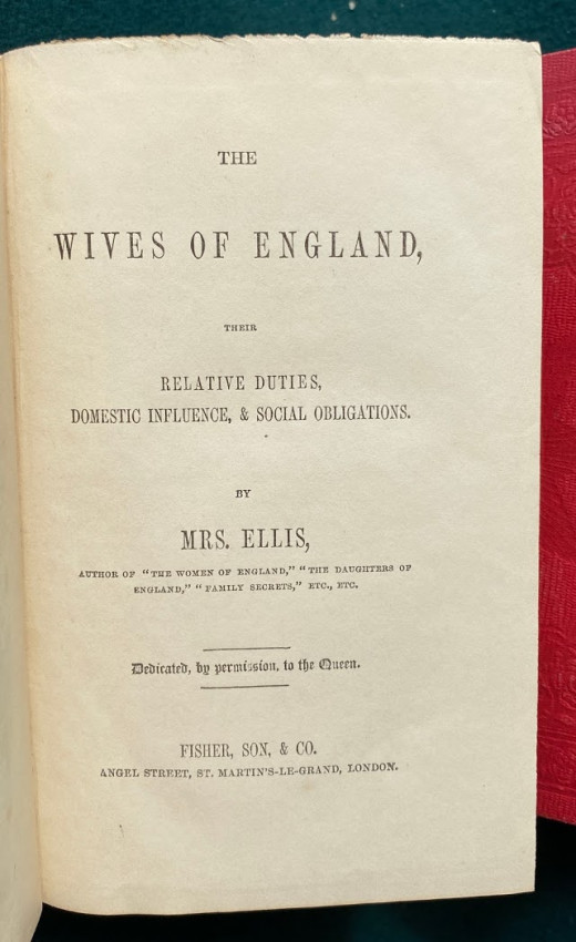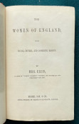 c) The Wives of England. Their relative duties, domestic influence, & social obligations ... Dedicated, by permission, to the Queen. London: Fisher, Son, & Co., [no date]. (Lacks front free endpaper). First published March 1843.