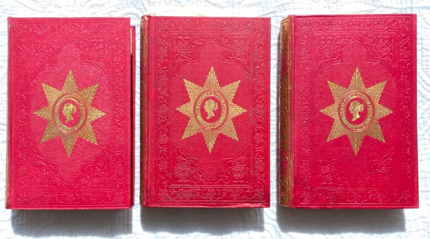 [The Englishwoman's Family Library] The Women of England; The Wives of England; The Mothers of England. London: Fisher, Son & Co., [no date - no date] - 1843. 3 works only [of 4] in 3 volumes, small octavo (6 3/8 x 4in; 162 x 102 mm). Two engraved frontispieces. (Some spotting). Publisher’s red cloth, spines lettered and blocked in gilt, covers blocked in gilt and blind, pale yellow endpapers, gilt edges (occasional slight discoloration, and bubbling to te cloth but overall excellent). Provenance: Lucy M. Chamberlin (inscription in each volume: “ Lucy M. Chamberlin / Presented by her Father Jany. 1st 1849”)