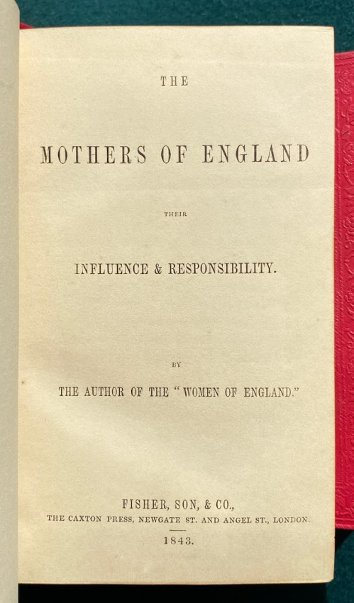 c) The Mothers of England. Their influence & responsibility. London: Peter Jackson, late Fisher, Son, & Co, 1843. Possible first edition?.