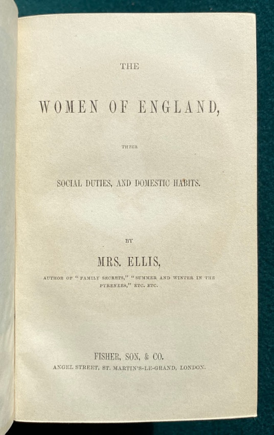 a)The Women of England. Their social duties, and domestic habits. London: Fisher, Son, & Co., [no date, but 1848 or earlier]. Engraved portrait frontispiece. First published 1839.