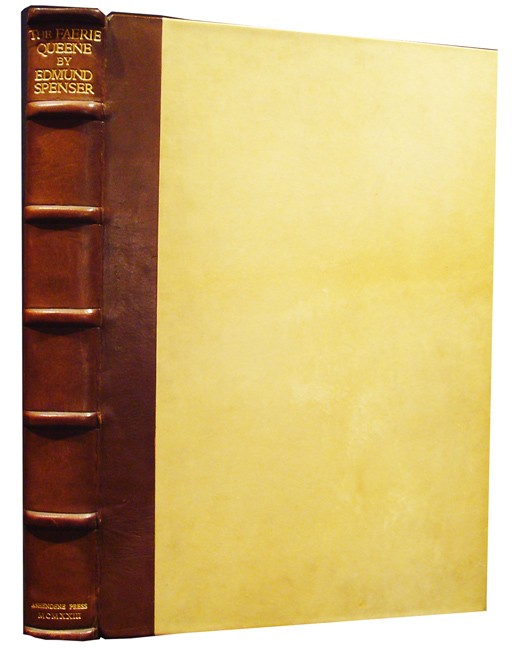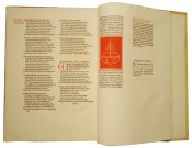 (iv), 406, (i colophon) pages, folio (435 x 300 mm), printed in black, red and blue in double columns with initials designed by Graily Hewitt, original quarter dark brown calf – with seven raised bands and gilt titling – and vellum over wooden boards, edges uncut (with some very light spotting), contents crisp, a very good copy.