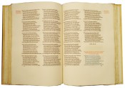 (iv),216 pages, folio (435 x 300 mm), printed in Subiaco type in black, red and green in double columns, original quarter dark brown calf – with seven raised bands and gilt titling – and vellum over wooden boards, edges uncut (with some very light spotting), contents crisp, a very good copy.