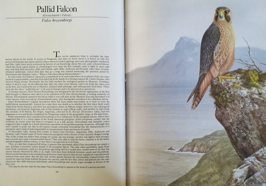 This book combines detailed descriptions and distribution maps (there are 5 pp of these in two colours) of the world's 39 falcon species (including hobbies and kestrels) (Falco is the single genus), with brilliant paintings of each species. The many scientific tables include the hunting success rates of various species in different conditions (from 5% and 7.5%, for autumn migrations, to as high as 93%, for nesting, coastal marsh).
