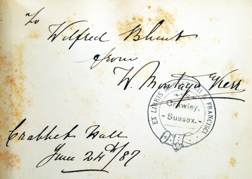 Author's signed presentation inscription to the famous poet and Islamist Wilfred (sic) Blunt on frontis. recto.