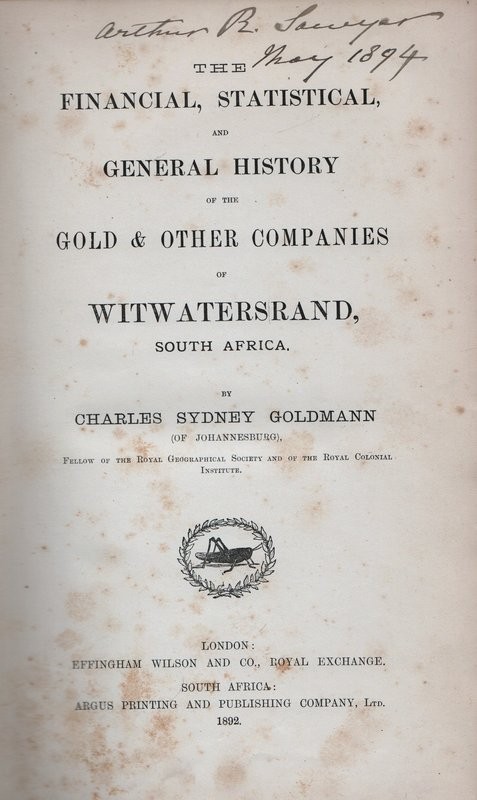 Owners signature in several pages "Arthur B. Sawyer May 1894" to fep and title page. stamp "withdrawn Johannesburg Public Library". Spine shows energetic insect depradations, but title at top unaffected. ff tanned but a sound copy complete with excellent foldout map (lightly tanned, no tears).