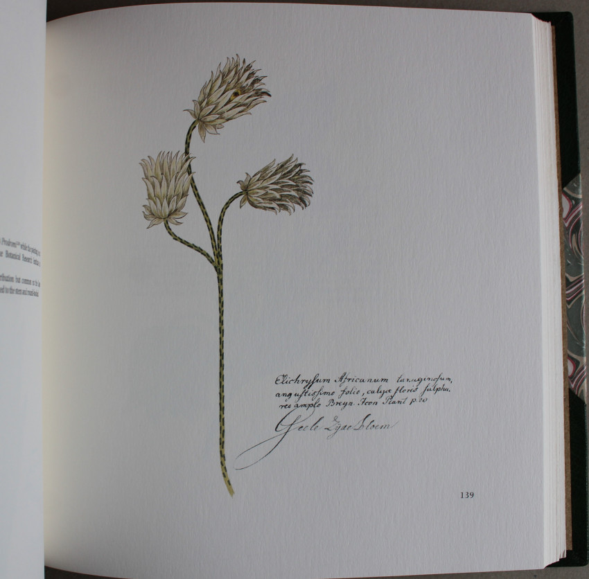 “Jakob Breyne (1637—1697) and his son Johann Philipp (1680—1764) were wealthy merchants of Danzig who collected rare and exotic plants. In 1724 Johann Philipp had 86 watercolour drawings of plants from the Cape of Good Hope bound in an album. All the drawings are unsigned and were executed by several artists. The Cape is well known for its profusion of indigenous wild flowers, and these centuries-old paintings are here reproduced for the first time, together with an introduction, and notes on each plant depicted”. -The Brenthurst Press.