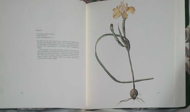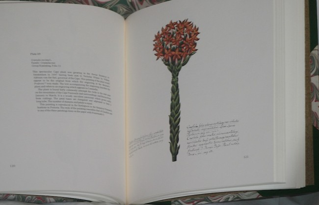 “Jakob Breyne (1637—1697) and his son Johann Philipp (1680—1764) were wealthy merchants of Danzig who collected rare and exotic plants. In 1724 Johann Philipp had 86 watercolour drawings of plants from the Cape of Good Hope bound in an album. All the drawings are unsigned and were executed by several artists. The Cape is well known for its profusion of indigenous wild flowers, and these centuries-old paintings are here reproduced for the first time, together with an introduction, and notes on each plant depicted”. -The Brenthurst Press.