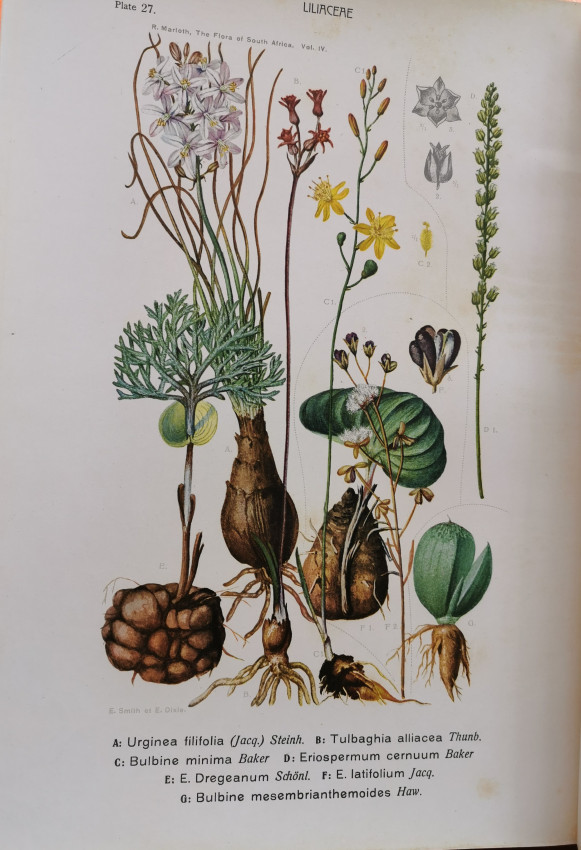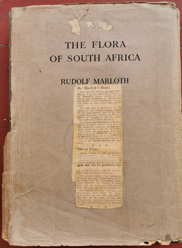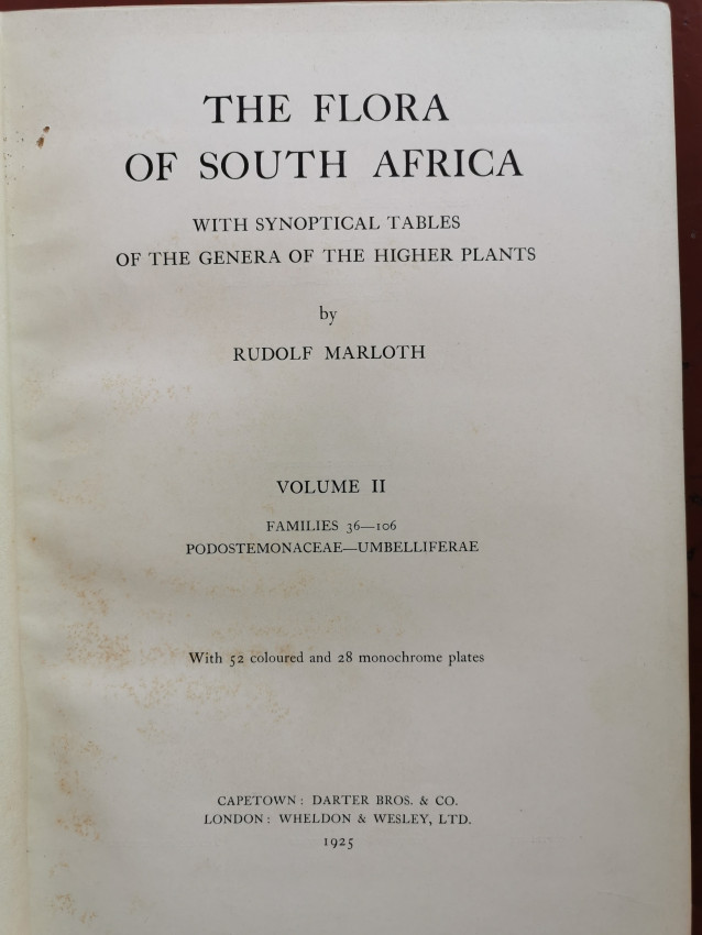 Marloth was an analytical chemist by profession and soon after he arrived in Cape Town in 1883 he started a herbarium of South African plants. He was devoted to the search for rare flora and he went on botanical expeditions as far afield as the Karoo, the Free State, Botswana and Namibia. The originals of the colour plates were painted in Cape Town by artists such as Ester Smith and Ethel May Dixie and printed in Germany.