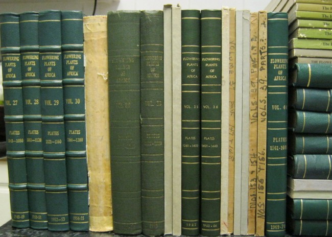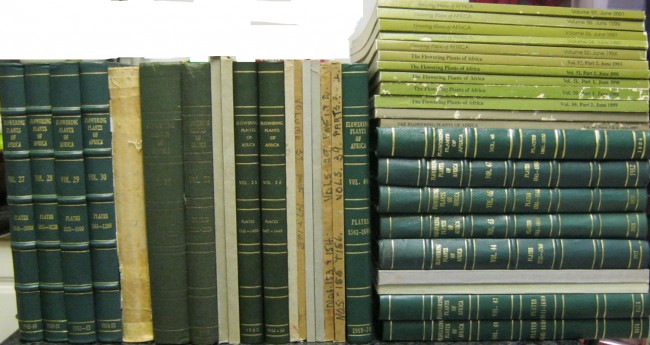A fine run of 31 complete volumes, from volume 27, 1948 - volume 57, 2001, some bound in hard covers by the National Botanical Institute, others in original wrappers. Each volume consists of two parts (until volume 52, from volume 53 each volume was issued complete in one part - which contains 20 descriptions, with 20 colour plates). All parts were issued separately in wrappers, but also available in green (or red) cloth, bound in one volume. Each volume consisted of 40 descriptions of plants, illustrated by 40 colour plates (apart from volumes #53-). The first 26 volumes were issued in England & plates were hand-coloured. All the volumes in this collection are in English. There are a total of 1100 colour plates in the 31 volumes on offer. A wonderful opportunity to acquire about half of the published work at a reasonable price. Pretoria Government Printer, 1948 - 2001. First editions. 31 volumes. 4to. Volumes #27-30, 32,33,35,36,40,41,42,44-48 all bound in green cloth, volume #31 disbound, without wrappers, volumes #34,37-39,43,49 in original grey printer wrappers, volumes #50-57 in original green printer wrappers. A few of the hardcovers are a bit worn or marked, some spine faded, volume #31 is from a library, but only has a stamp on the front end-paper. Some marks on end-papers, a few pages coming loose, some of the wrappers a bit worn, some fishmoth damage to some wrappers. PLEASE ENQUIRE FOR DELIVERY COSTS AS THESE BOOKS ARE RATHER HEAVY