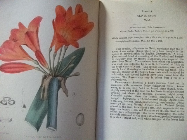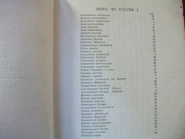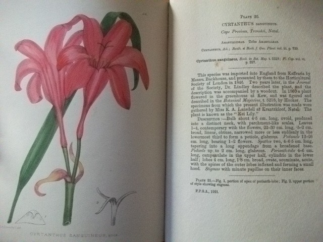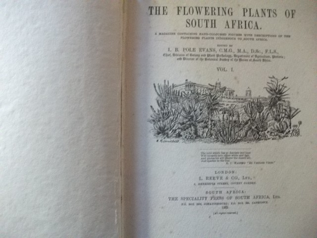 CONDITION NOTES. As R A Dyer, I B Pole Evans's successor as director of the [South African] Botanical Survey, noted in 1945, "some years ago a fire destroyed all the unsold stock of Volume I . . . In order to make it possible to meet recent orders for complete sets . . . a limited number of copies [of this volume] have been produced by the photostat method". This copy is one of the original volumes, with its brilliant hand-coloured plates. The upper board is damaged at the lower corner and rubbed elsewhere. The upper outer hinge has been glued. The binding remains tight. The free endpapers are sunned. There are a few small insect holes at the foot of the front endpaper and prelims, but they are well clear of the type area. The plates are in fine condition. There are light brown transparent stains to a few of the description pages. The copy has no ownership or other markings and, except for the insect damage referred to, the contents are in very good condition, with no foxing or other discolouration, with the plates, on art paper, entirely undamaged and with their colours still bright and rated no less than fine, making this a suitable and inexpensive copy for the collectors already referred to.