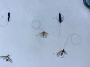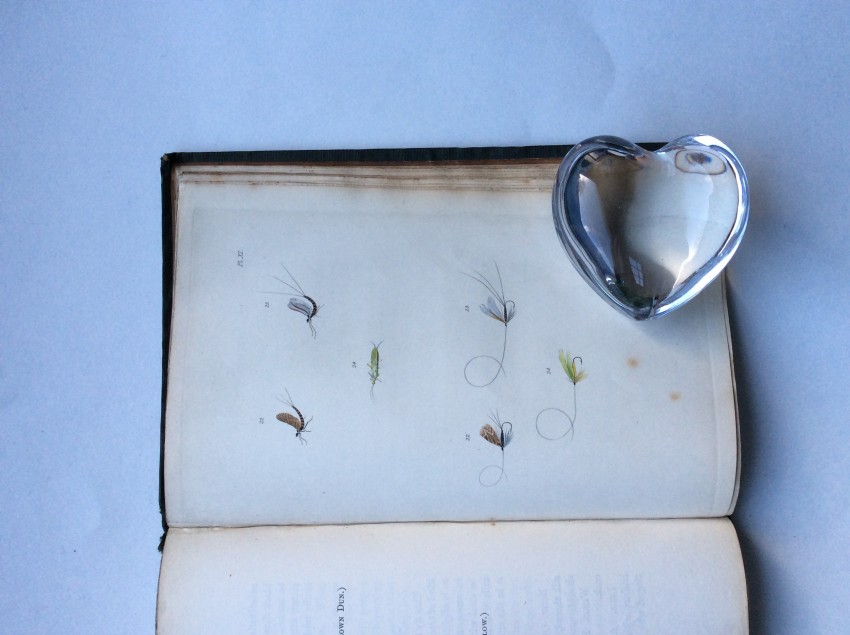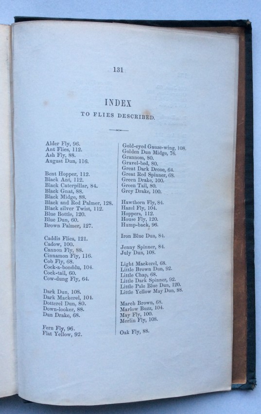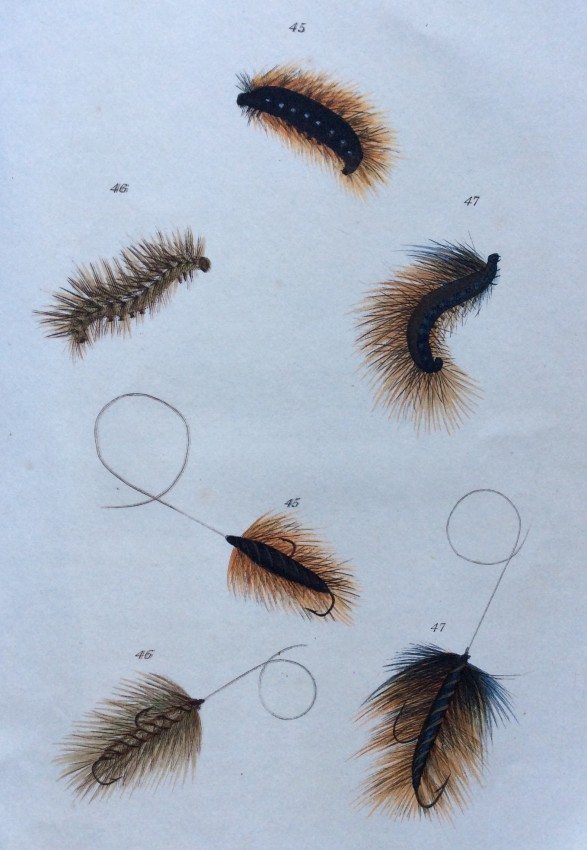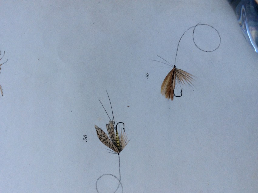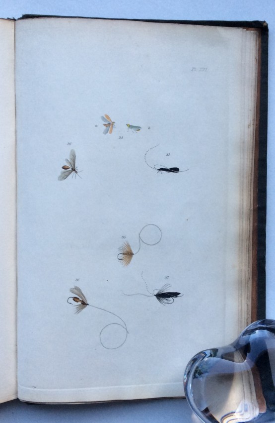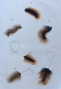 The plates include a valuable series where the natural insects are placed immediately above their artificial counterparts. The plates are ordered chronologically according to when particular insects are most abundant: Mayflies in May, Red Ants in July, etc. The text includes details of the individual insect’s habits and habitat. This is followed by notes on what materials to use to create the artificial fly. The Wheatley ‘Companion’ conforms to the ‘Type 4’ listed in the online ‘Richard Wheatley Museum’: the flies are generally in good condition, but a trifle squashed. The shape of the hooks and the fact that they are eyeless suggest that they are early but we cannot not guarantee this.