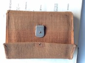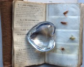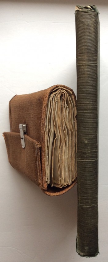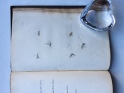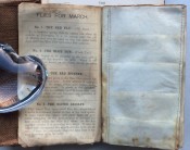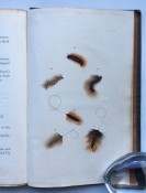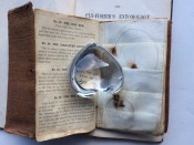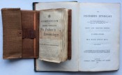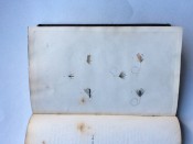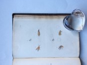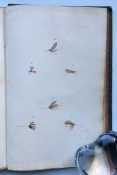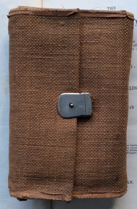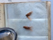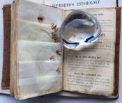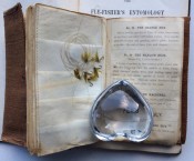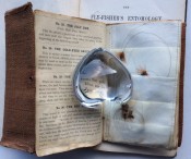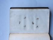 Small octavo (6 x 3 ¾ inches). Letterpress title and 14pp. text on 8 leaves, these leaves interleaved with six leaves made of vellum strips sewn together to form four pockets per page, the central gathering formed of two leaves of thin white felt, the pockets with a total of 32 actual examples of eyeless flies (possibly 19th century?), most with attached gut. Original wallet-style brown canvas, edged with pigskin, with white metal clasp, two internal pockets.