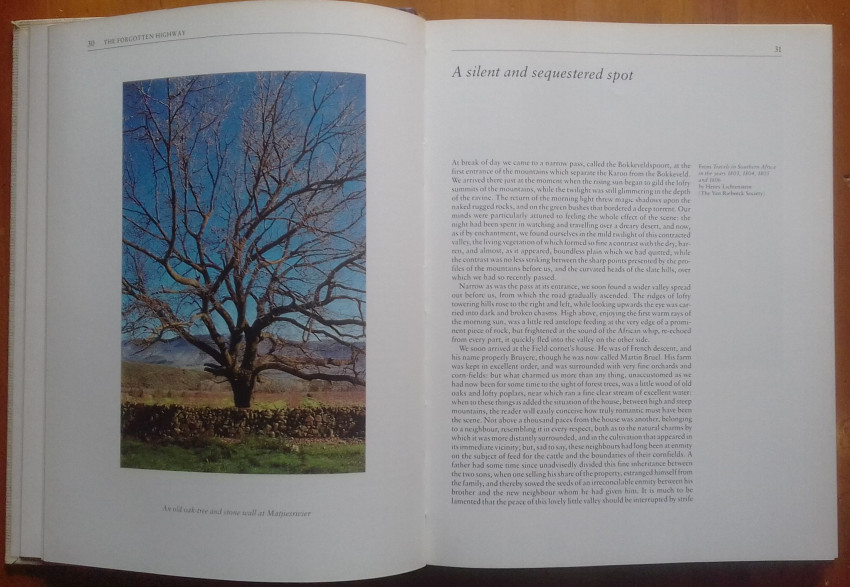 'The Forgotten Highway formed part of the old route to the North and was used by explorers such as Burchell and Lichtenstein. The route to the North played a cardinal role in the development of Ceres as a village. The route ran through Ceres and many transport riders, miners, mail coaches passed through the village and provided the boost for economic development and prosperity. For more than 200 years, travellers used Karoopoort as a place to stay over before venturing on into the interior. Karoopoort is situated 43 km from Ceres and is presently being farmed. Between Karoo Poort beyond Ceres and Verlaten Kloof there is a long-forgotten highway which was once part of the great road to the north-east.' (Source: www.safarinow.com)