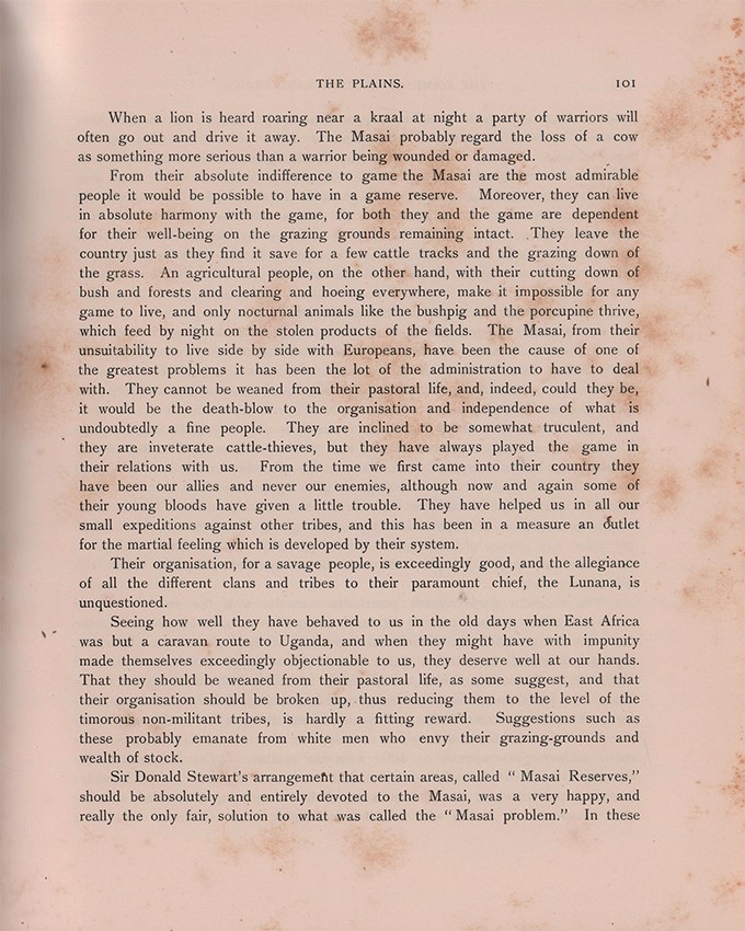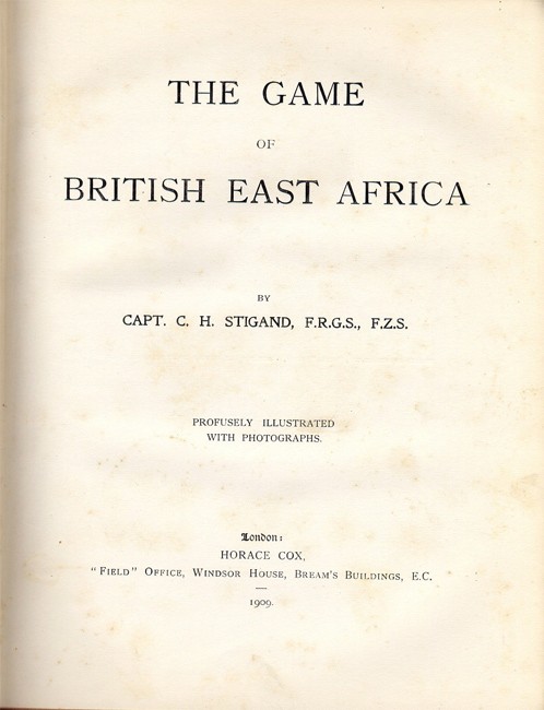Czech (Kenneth) An annotated Bibliography of African Big Game Hunting Books, 1785 to 1999, page 268. ‘A handsome volume that examines wild game, its habitat and spoor within Kenya, Uganda and the eastern Congo Regions. Stigand observes game traits on the plains, and in the bush and forested areas detailing animal movements, coloration and even preservation of game. There are interesting chapters comparing hunting big game to shooting and also on stalking.’