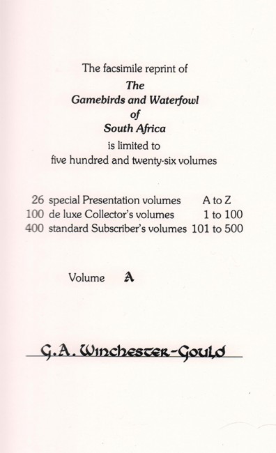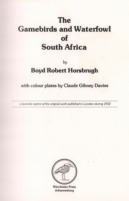 160 pages, colour frontispiece of Fulvous Whistling Duck from a watercolour by Finch-Davies, 65 colour plates from the original edition, 2 portraits of Horsbrugh and Finch-Davies, full green morocco over bevelled boards, spine slightly faded with a title label gilt, a very good copy in the marbled paper covered slipcase with leather lips.