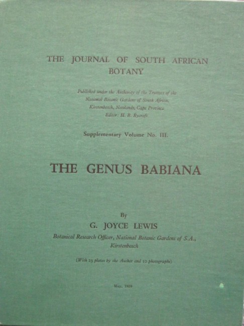 A monograph on this endemic South African bulb genus. "The Journal of South African Botany" Supplementary volume no. 3. Original cloth, pp. 149, plates (some colour). Covers & spine a bit rubbed, text lightly browned, signature of Janet Gibson on end-paper