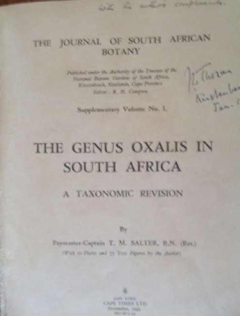 One of the most elusive South African botanical items, as only a small quantity of an important monograph were published and never reprinted. \"The Journal of South African Botany\" Supplementary volume no. 1. KERKHAM #578. Bound into hardcovers, without the original plain wrappers, pp. 355, 10 plates, portrait, illustrations. INSCRIBED \"WITH THE AUTHOR\'S COMPLIMENTS.\" Covers marked, previous owner\'s details & date (1945) on title-page, light foxing.