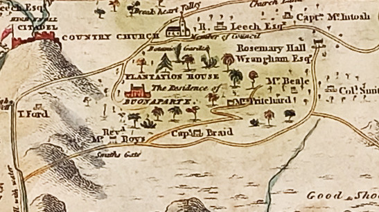 This plan was published in four versions, following the change of residence of “Buonaparte”. The first version placed the residence at Plantation House. This error was rectified in version two, which correctly attributed The Briars as his place of residence (as a guest of the Balcombe family).