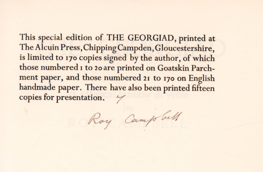 The limitation reads, 'This special edition of THE GEORGIAD, printed at the Alcuin Press, Chipping Campden, Gloucestershire, is limited to 170 copies signed by the author, of which those numbered 1 to 20 are printed on Goatskin Parchment paper, and those numbered 21 to 170 on English handmade paper. There have also been 15 copies for presentation. no. 7