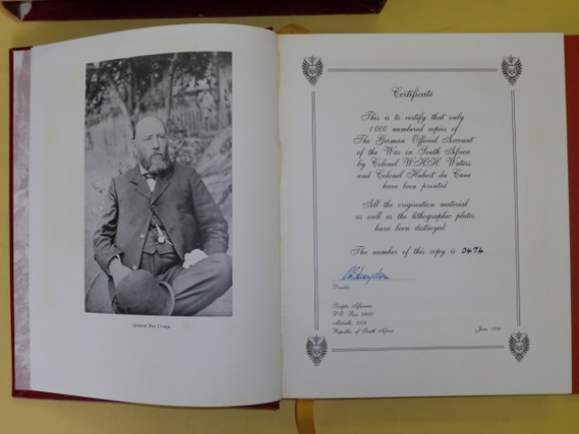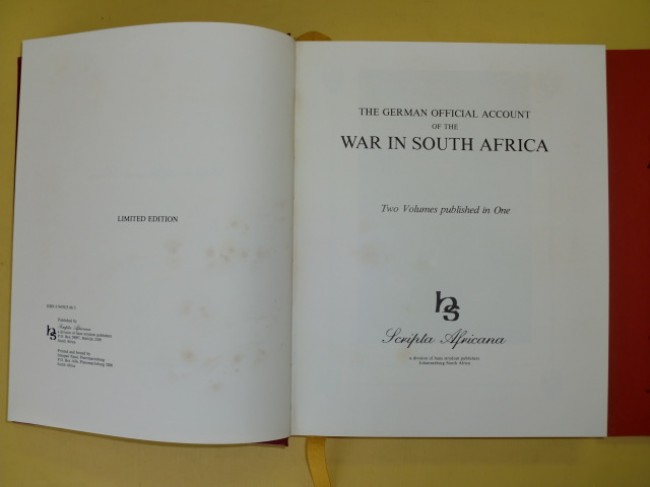 Scripta Africana is proud to publish these very rare volumes in one book. It is Number III in our Series of rare historical books and I think our members agree that our collection is building up into an impressive and valuable series. The authoritative Mendelssons\' South African Biography on African books says of \'The German Official Account\': \"The work is characterised by the thoroughness which is so prominent a feature of German productions of this class, and despite constant criticisms of the British methods and military tactics, is written in a perfectly fair and unbiased manner.\"(p.590).