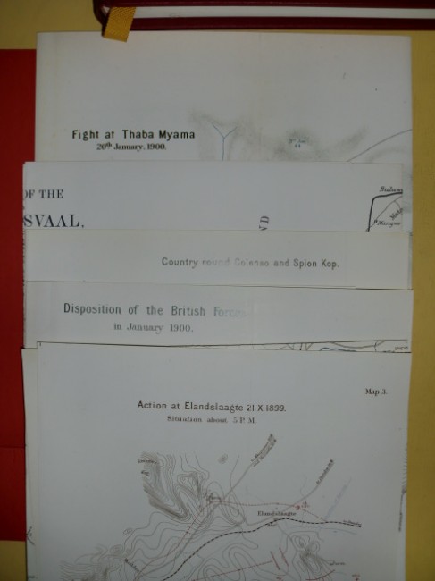 Book condition: excellent, near fine copy, due to the fact that it has been housed in a slip-case, red boards very good, with only some wear to the gilt spine titles, and foxing to end-papers and title page; top edge gilt, contents bright, tight, and clean (except for some spotting to illustration between pp.52/3 which was exposed to air due to the ribbon place marker being inserted here), total 218pp. plus index. A separate bright red folder contains a full set of 17 detailed individual maps of the battlefields, all in excellent condition (folder spine is faded). The board slip-case is in very good condition, but is worn at the edges with very minor bumping on the corners, and is faded and slightly marked.